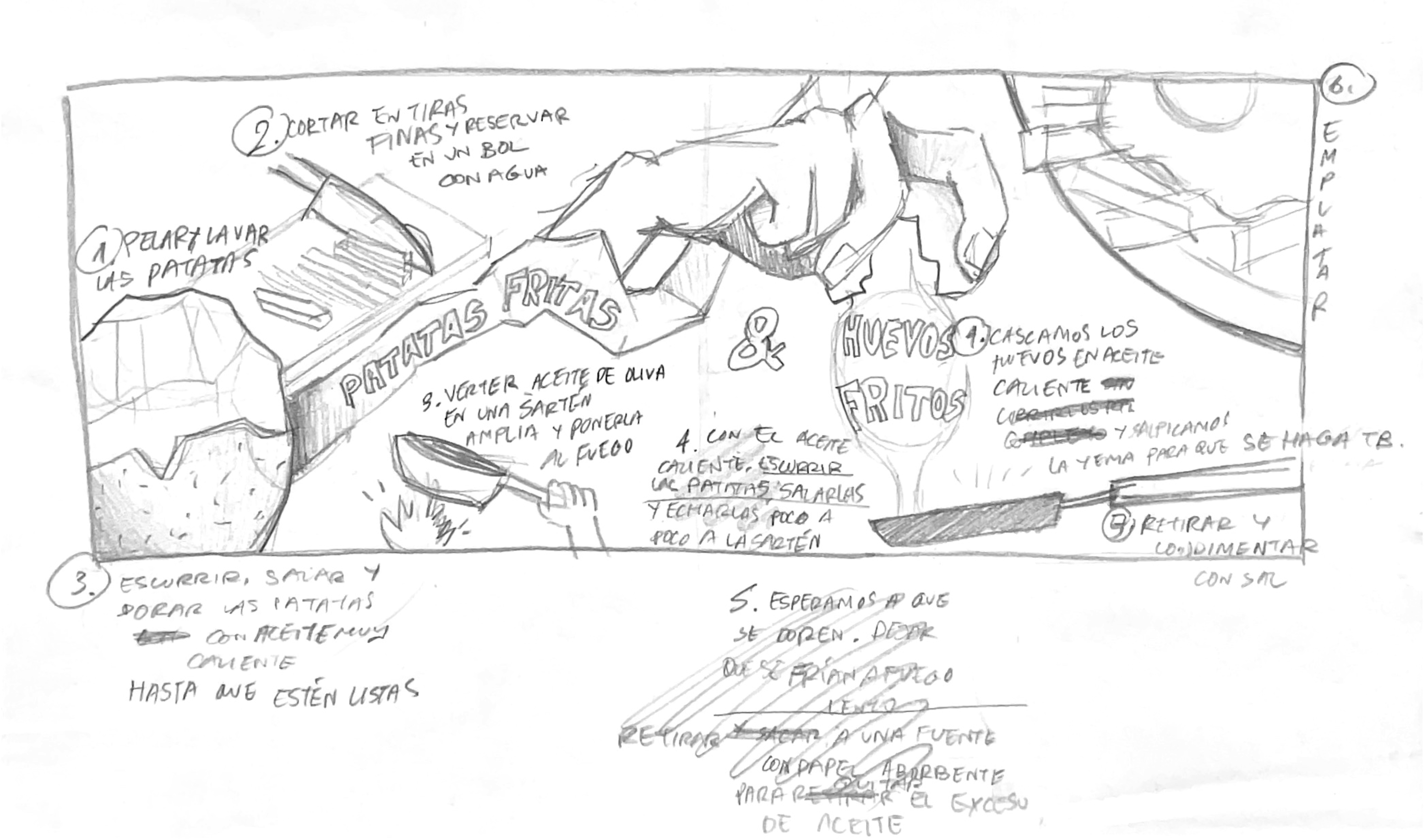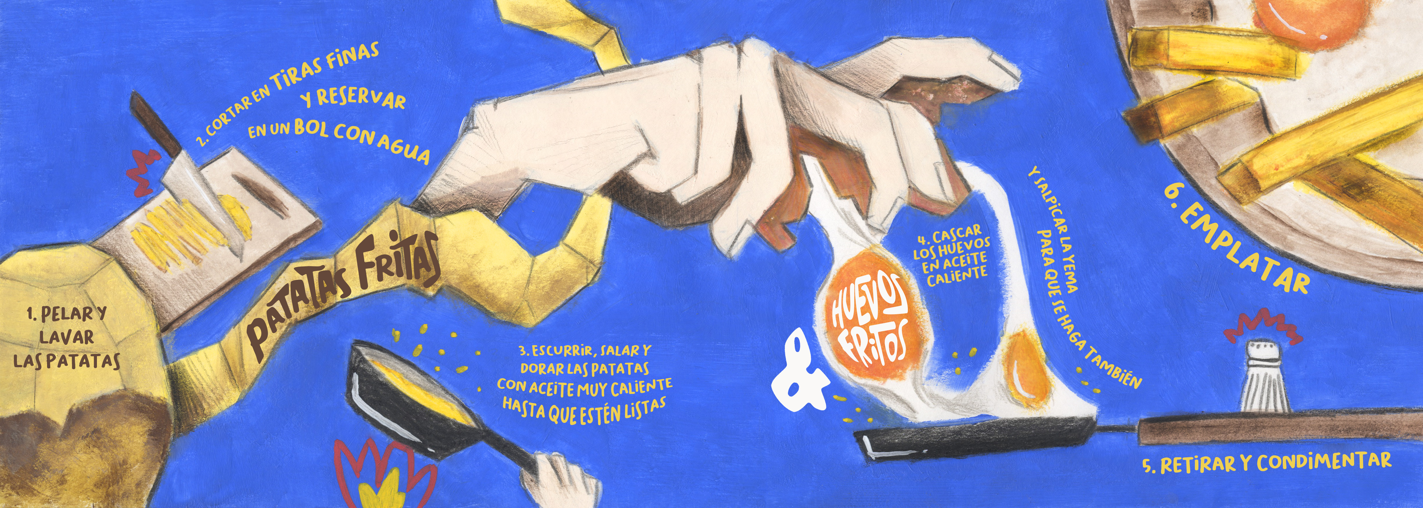 Para el ámbito gastronómico, se presenta una ilustración en formato alargado que acompaña a la narrativa de la receta escogida: los consagrados huevos con patatas fritas.